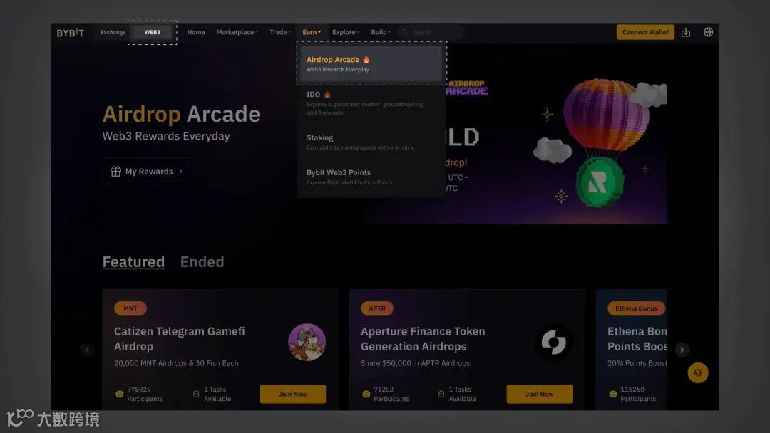 访问 Bybit 官网,通过导航栏前往 Web3 → Earn → Airdrop Arcade
