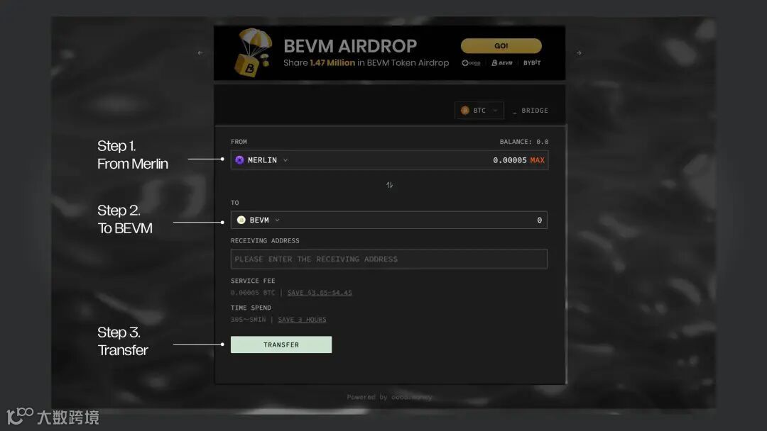 第二步:点击 Bridge 进入跨链页面,连接 Bybit Wallet 并选择从 Merlin 转出。选择转入 BEVM 链,填写并确认收款地址(Receiving Address)。填写跨链的资产数量并点击 Transfer。
