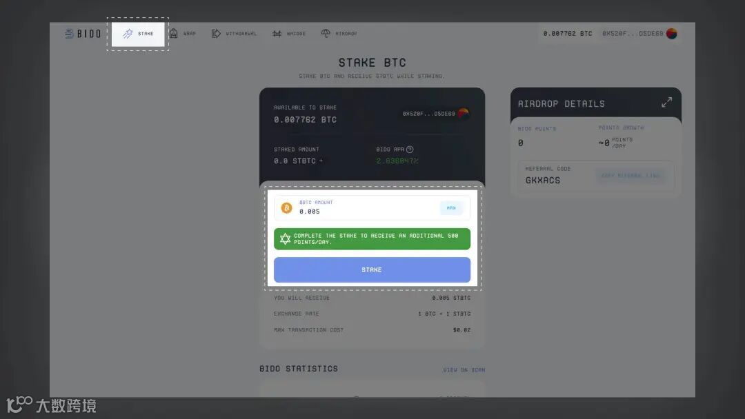 使用 Bybit Web3 钱包在 Bido 质押 BTC 即可完成本任务。