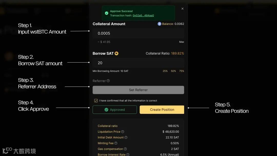 第四步:按照下图步骤,存入 wstBTC 并借出 SAT,点击 Approve,点击 Create Position。