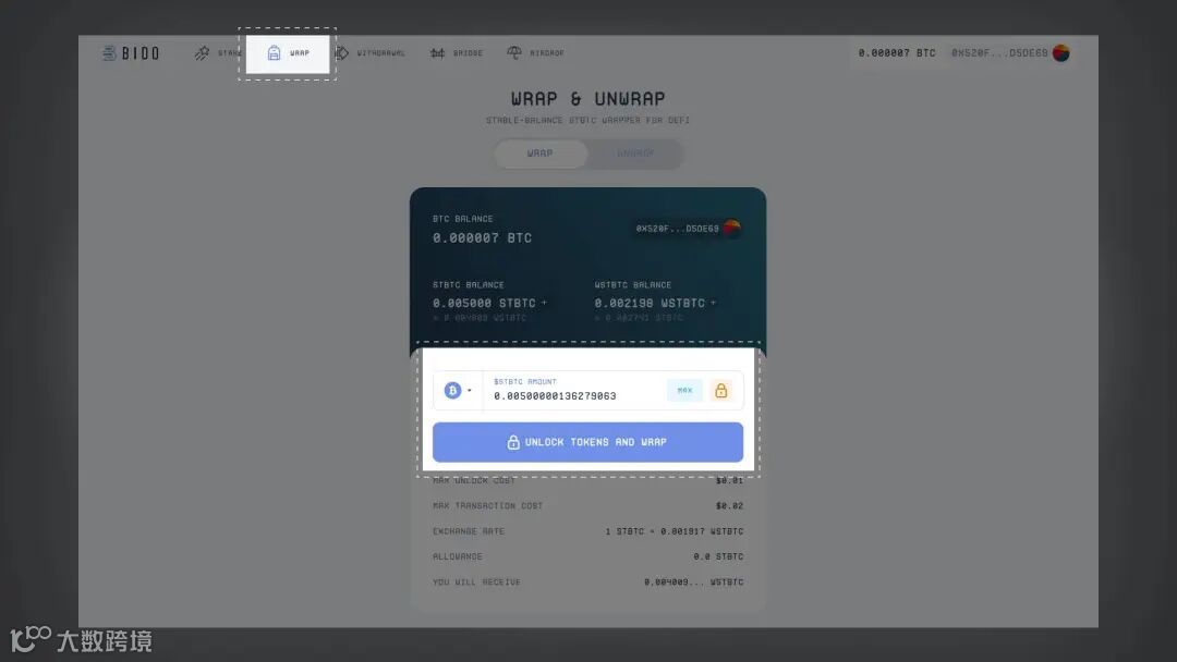 第三步:在导航栏前往 Warp,将 stBTC 封装为 wstBTC