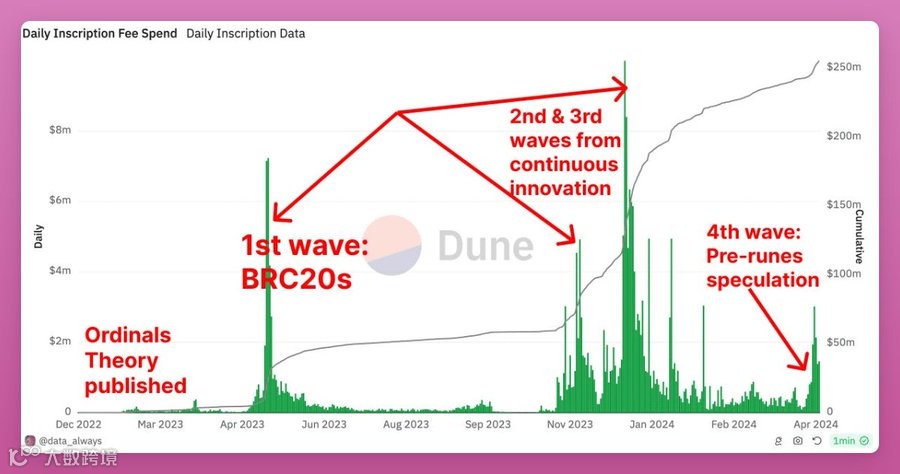 Ordinals于2022年12月首次亮相,在2023年5月BRC 20的推出引发了第一波浪潮。