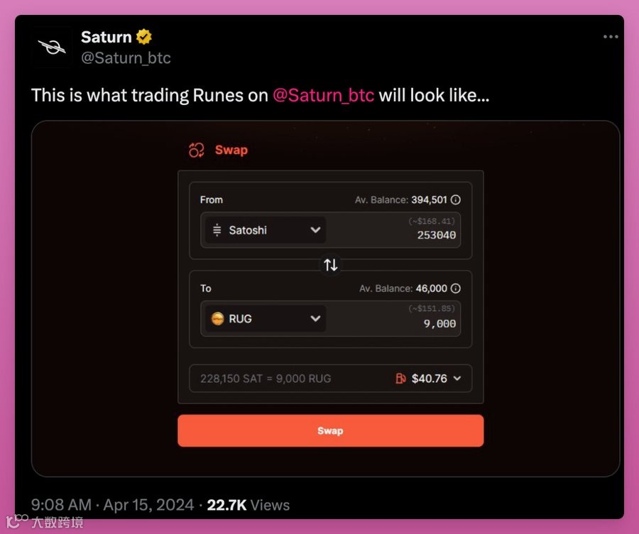 符文正在为Rune代币的多个协议和基础设施铺平道路,比如 Saturn正在为符文建立一个DEX或Liquidium正在构建一个借贷市场,但目前还需要时间来提升用户体验。