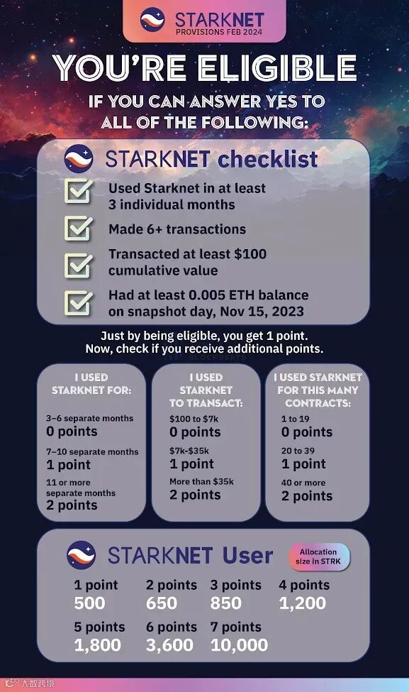 作为获得最大代币配额的 Starknet 用户,单个地址所获 STRK 数量将在 500 至 10,000 枚之间,获得空投资格的基本条件包括: