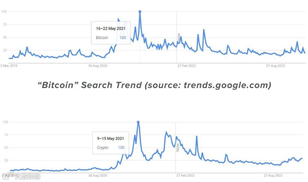 关于「Bitcoin」和「Crypto」的谷歌搜索趋势在 2021 年 5 月达到高峰,这也是在比特币价格达到 6.4 万美元之后。