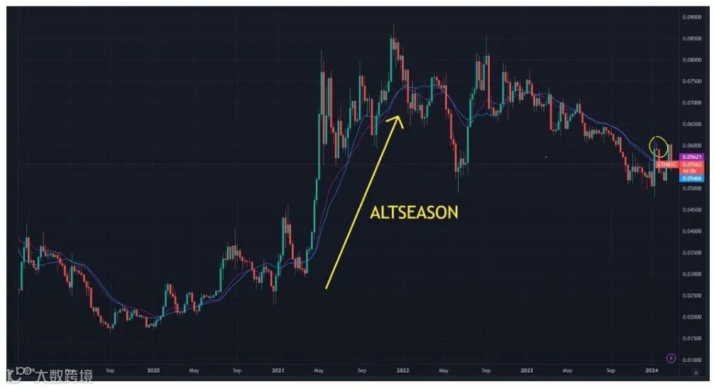 2024 年 1 月,ETH/BTC 汇率在 20 周移动平均线上方曾一度出现了假突破,让人误以为趋势开始转变。