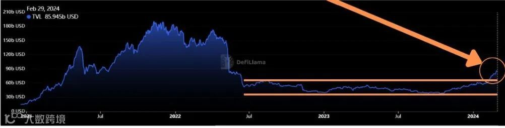 自 2022 年 6 月以来,DeFi TVL 一直在一个范围内波动(350 - 650 亿美元)。然而步入 2024 年,看起来我们正在突破这一区间: