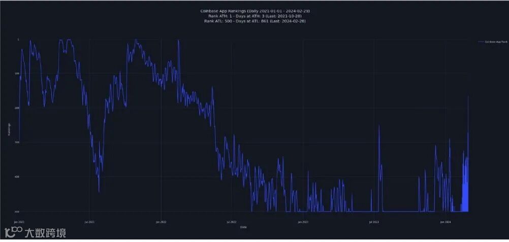 不过可以看到的是,散户的投资兴趣正在恢复增长,最直接的例证,就是由于需求过大,Coinbase 应用程序一度崩溃,并且它在应用程序商店的排名正快速攀升。