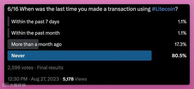 关于莱特币的真实活跃度,过去7天里只有28人使用了Litecoin,超过97.8%的人从未使用过,一个月前使用过有17.3%,但让人匪夷所思的是在DeFiLlama的每日活跃用户排名中,Litecoin排在第五,可能是刷的数据,又或是莱特币的社区不活跃