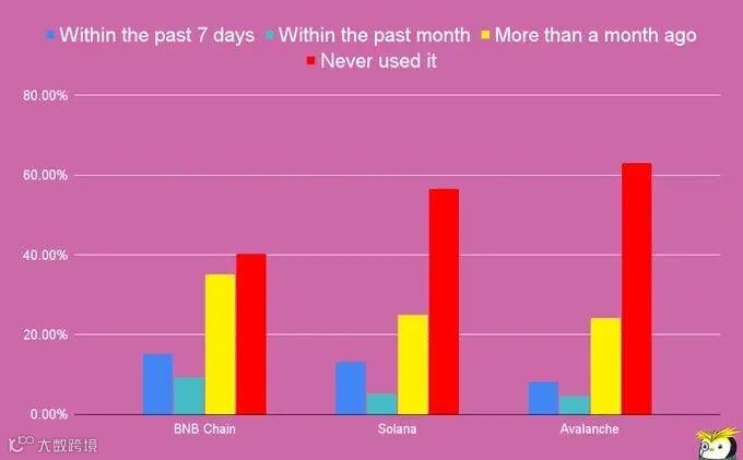 下面我们直接综合看一下BNB 、Solana 、 Avalanche,在过去的7天里,BNB与Solana和Avalanche相比有更多的用户,40%的投票者从未使用过BNB链,而Solana和Avalanche的却更高,分别是56%和63%。
