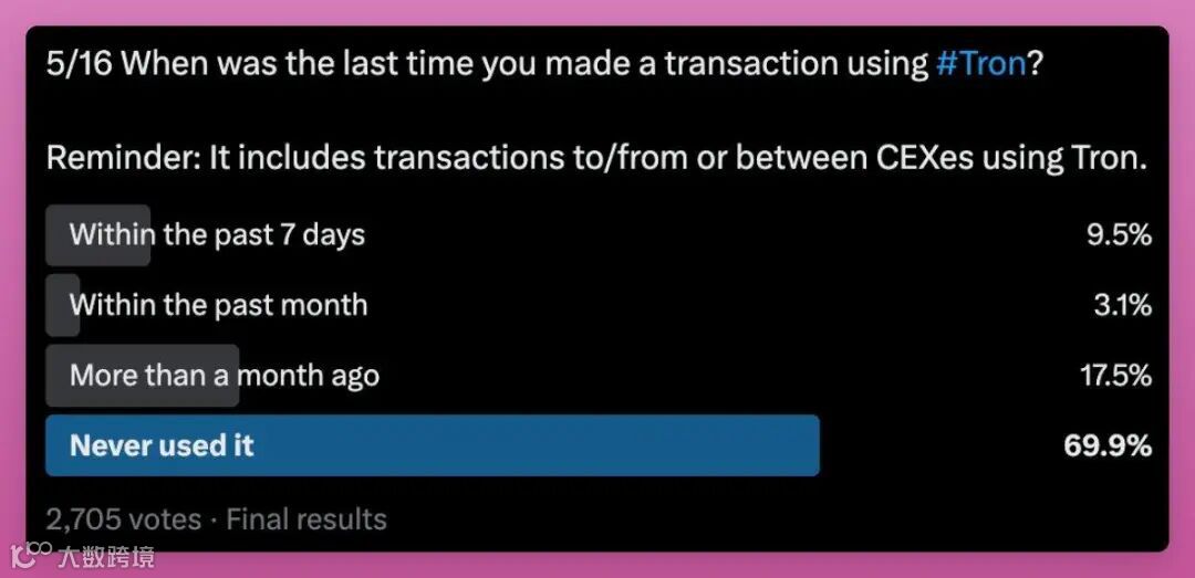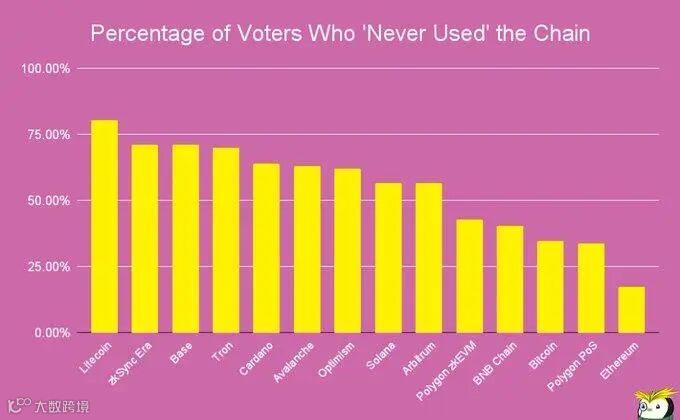 Tron的投票结果也比较奇怪,根据Defillama的数据,它是每日活跃用户最多的链,但超过70%的投票者表示从未使用过。