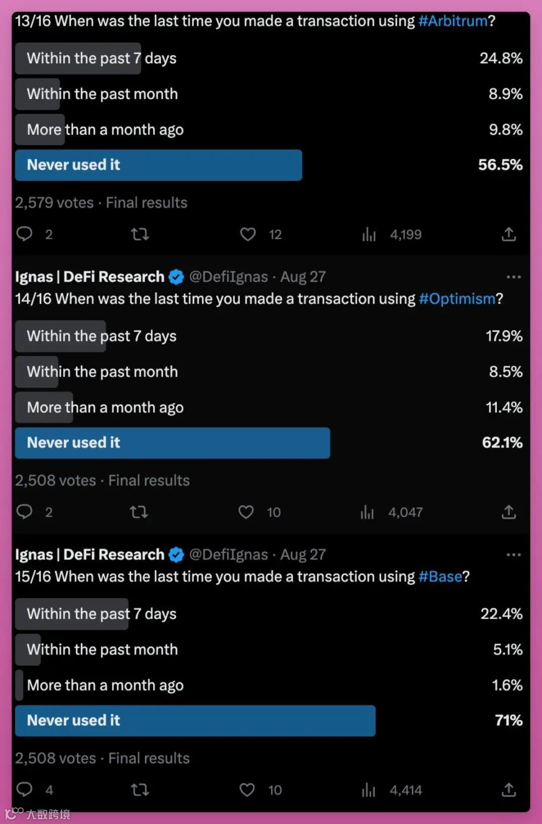 在过去7天里,四分之一的受访者使用了Arbitrum,Base和Optimism紧随其后。