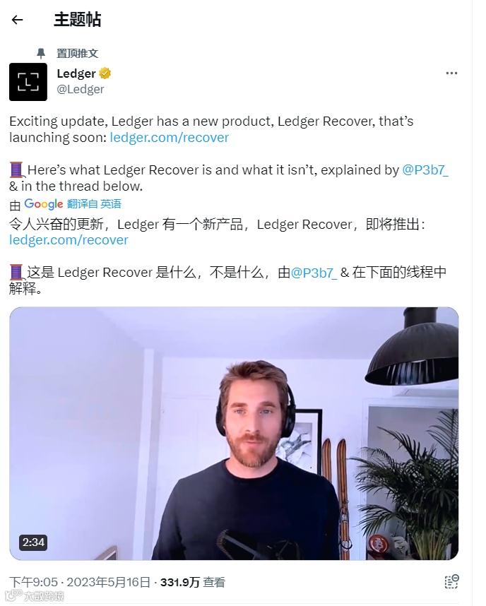 5月16日,Ledger推特发文,他们的硬件钱包增加了一个新的服务功能Ledger Recover , Ledger Recover 是一种基于身份认证的密钥恢复服务。