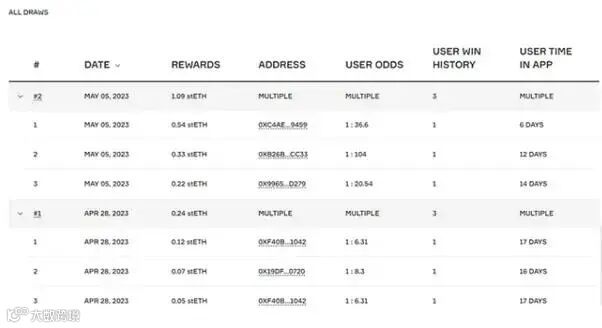 迄今为止,Asymetrix 已经在 14 周内通过周抽奖向 28 名幸运质押者分发了 87.95 stETH。与传统质押相比,这使质押者有机会在一次抽奖中获得所谓的年化收益率。