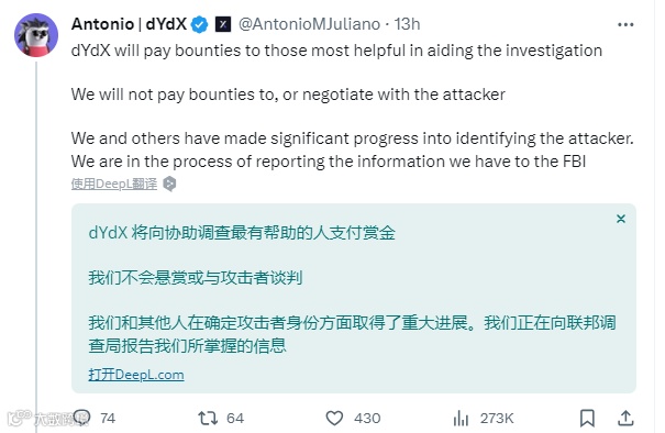 dYdX创始人Antonio在推特发文称,dYdX将向对调查帮助最大的人支付赏金。我们不会向攻击者支付赏金,也不会与他们进行谈判。