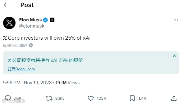 马斯克:X Corp(原推特)投资者将拥有xAI 25%的股份