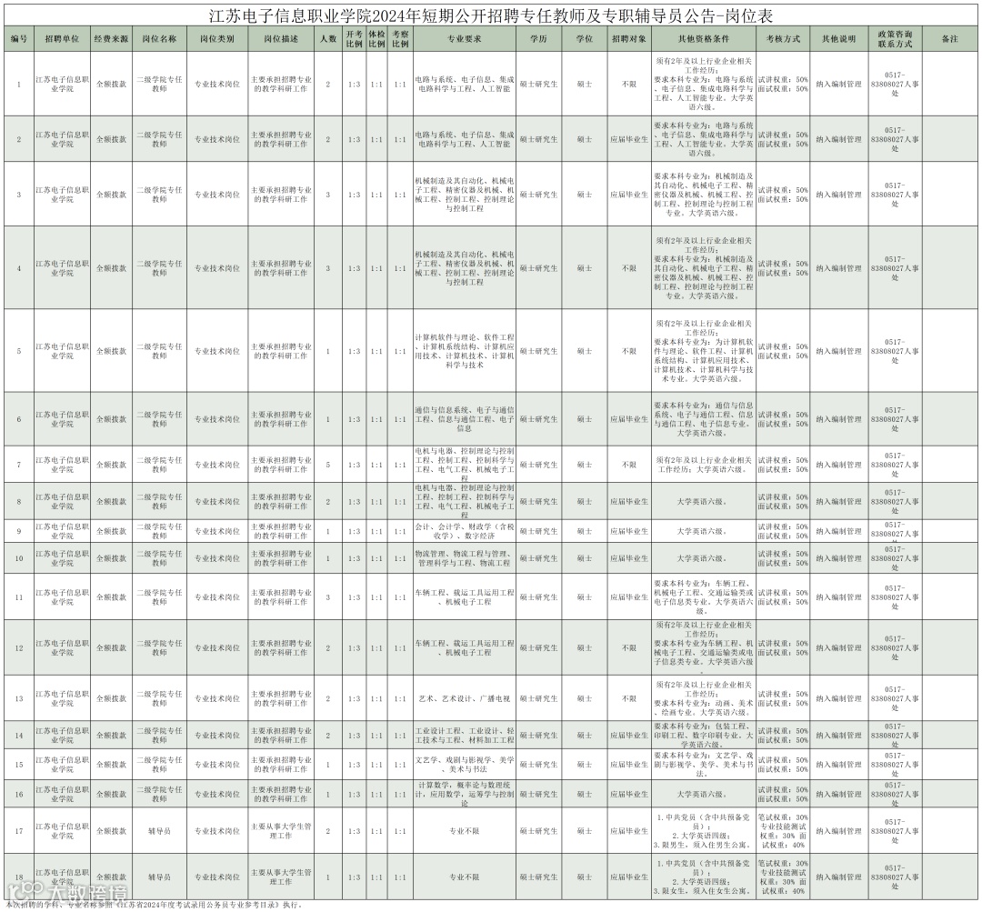江苏电子信息职业学院2024年短期公开招聘专任教师及专职辅导员公告岗位信息表
