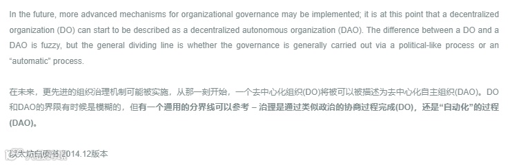 也可能是觉得这样的非自动化DAO才是当今技术所能支持的主流,以太坊白皮书也在后续的一次更新中删除了DO的概念,从而进一步模糊了DAO里的Autonomous的定义。