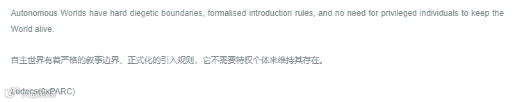 从这个角度讲,Autonomous World反而更接近原初定义的DAO,即在预设规则下自主运行,不依赖某个个体,也不依赖软性的规则或类似政治的协调过程。或者说DAO本身就是自主世界的一种形态,说到这里有没有感觉很像区块链的世界。