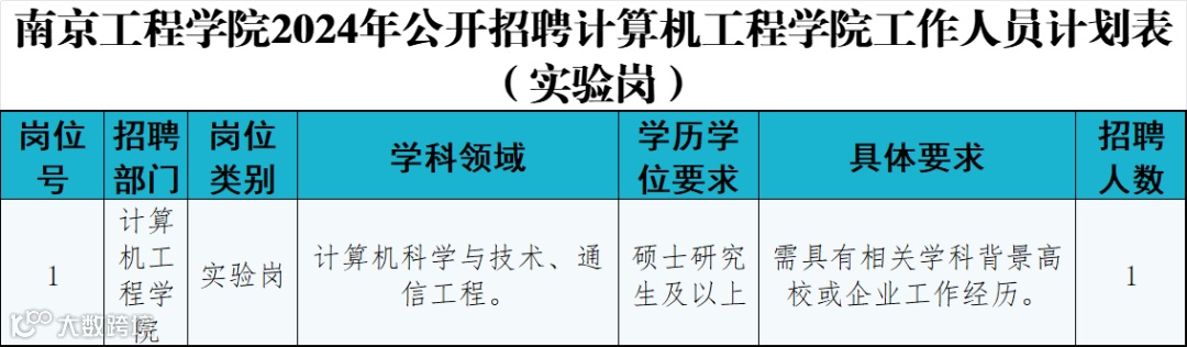 南京工程学院2024年公开招计算机工程学院工作人员计划表(实验岗)