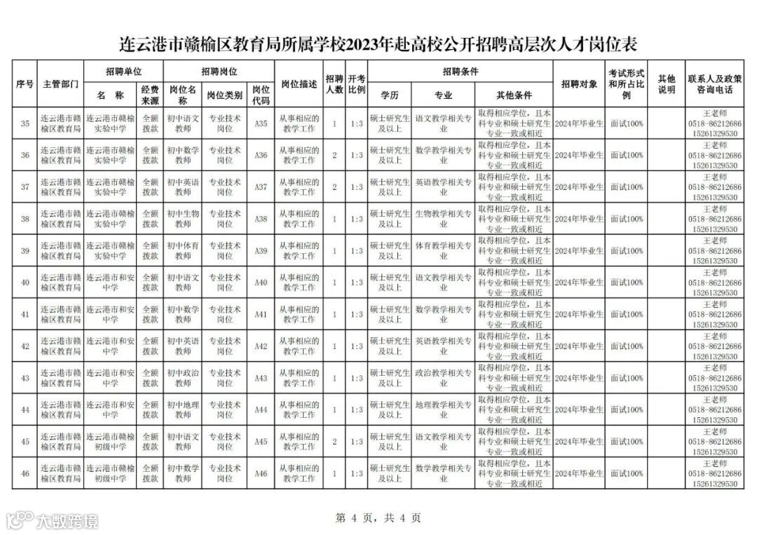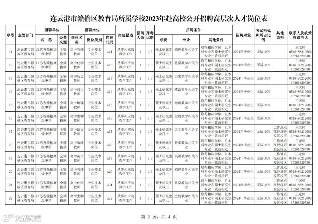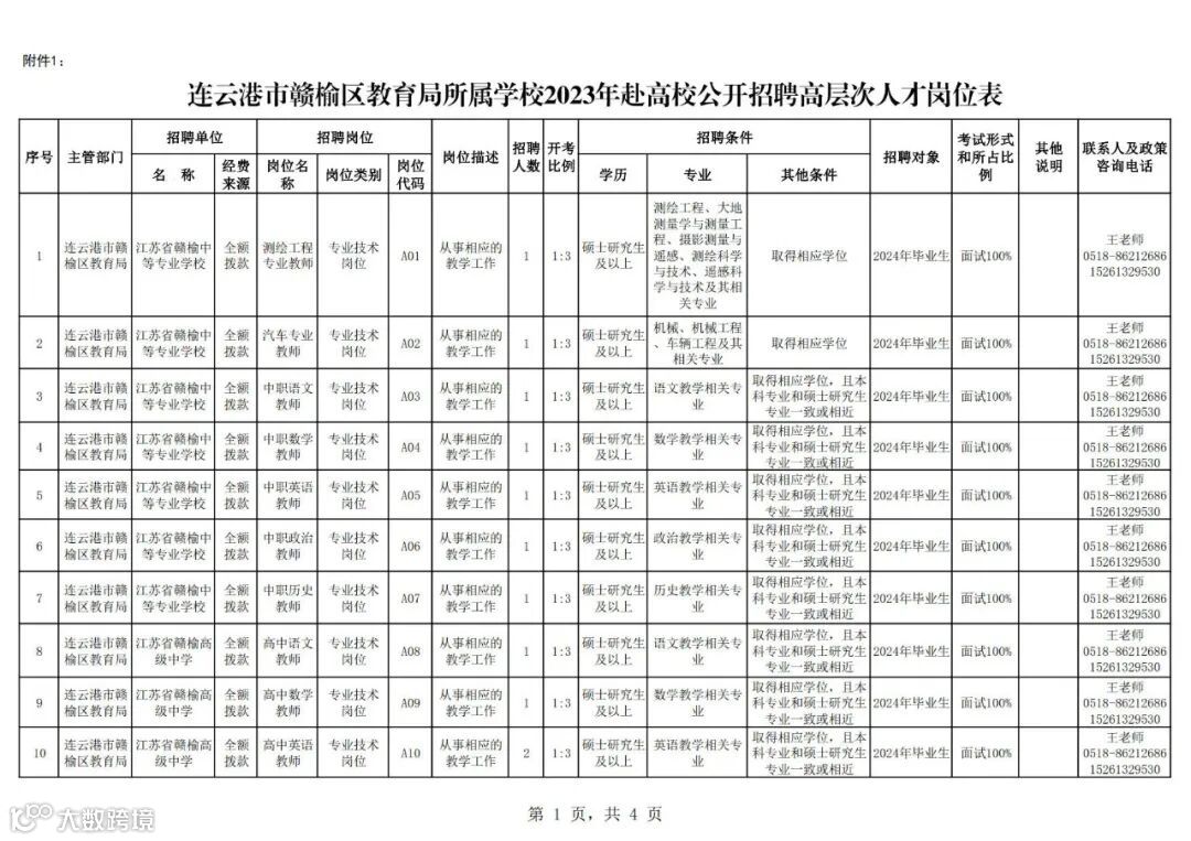 1.连云港市赣榆区教育局所属学校2023年赴高校公开招聘高层次人才岗位表