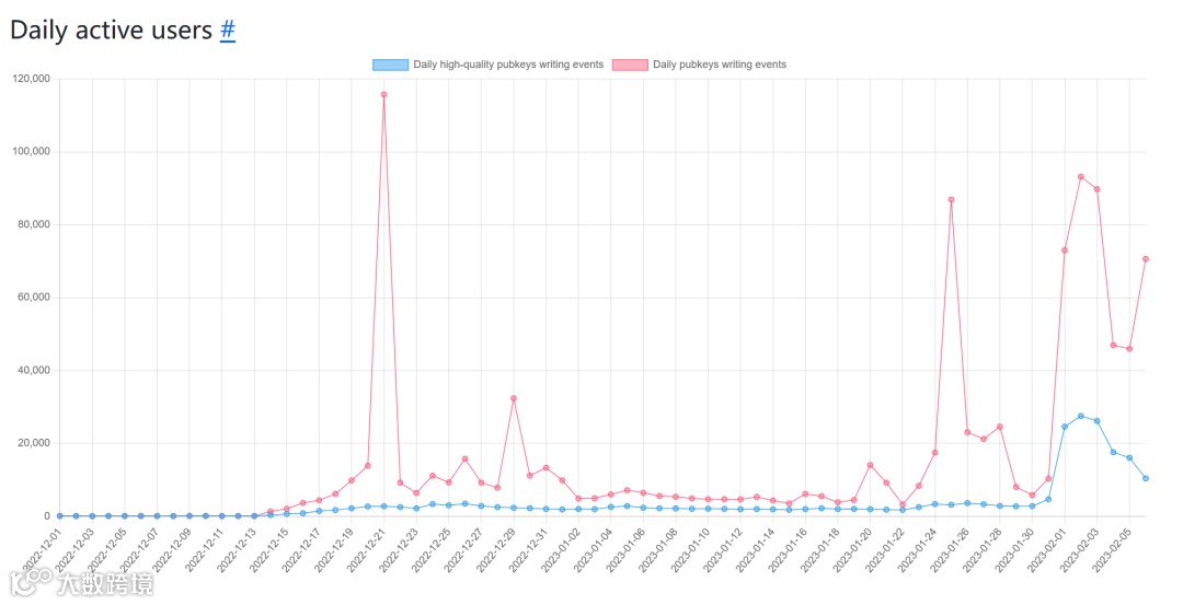 2月5日,Nostr.Band数据显示,去中心化社交协议Nostr账户数已突破72万,其中在主页设置个人简介的账户数接近37万,增长高峰第一次是在12月21日,在推特创始人JackDorsey宣布向其捐赠约14枚BTC之后;第二次是在2月1日Nostr协议第三方客户端Damus发布后。(图中蓝色折线)
