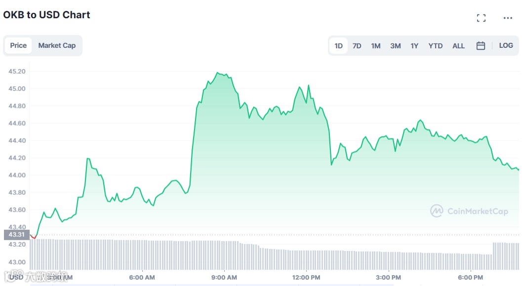 2月6日,Coinmarketcap数据显示,OKB短时触及45美元,创历史新高,目前回落至43美元。BTC和ETH价格变化不大,分别维持在23000美元和1645美元附近。