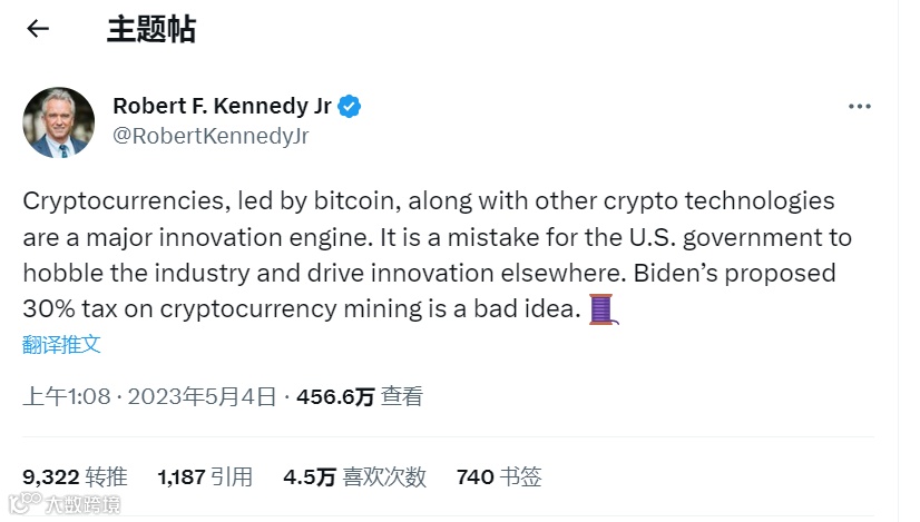他批评拜登提出的对比特币挖矿能源征税计划,并反对中央银行数字货币和联邦储备的支付系统。