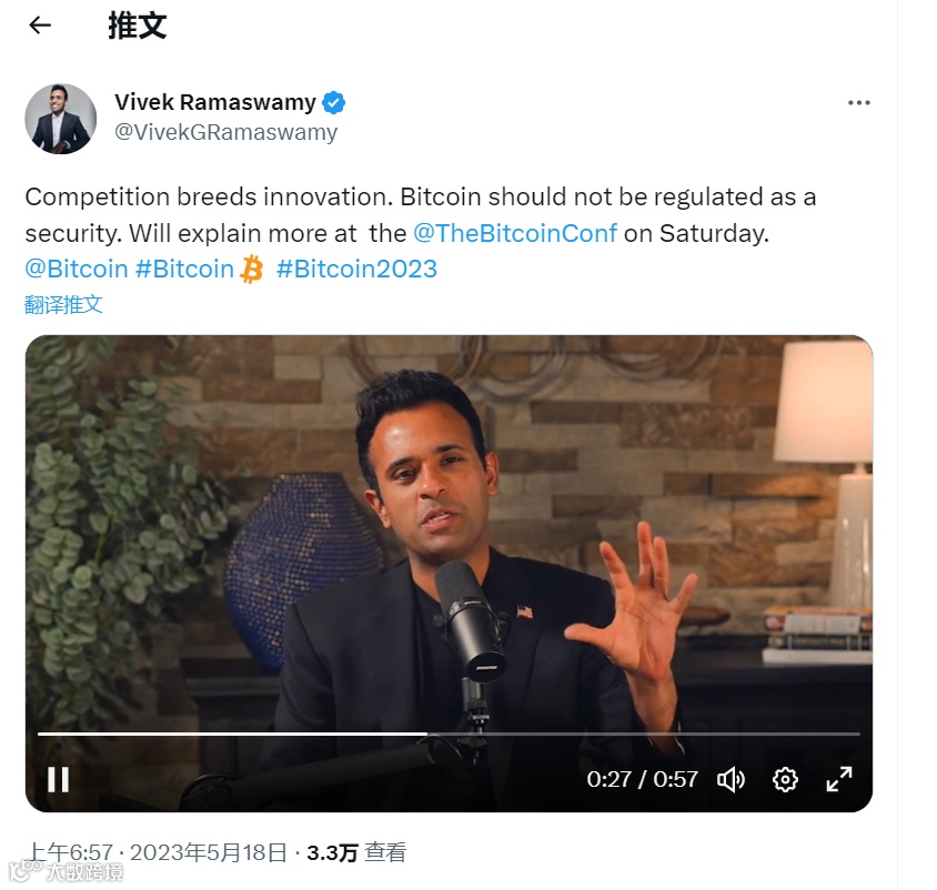 在Bitcoin 2023会议上,他宣布将接受比特币作为竞选捐款,并表示比特币不应被视为证券,它是一种数量有限、没有发行者的货币,不应该将其纳入现行证券法律的监管范畴。