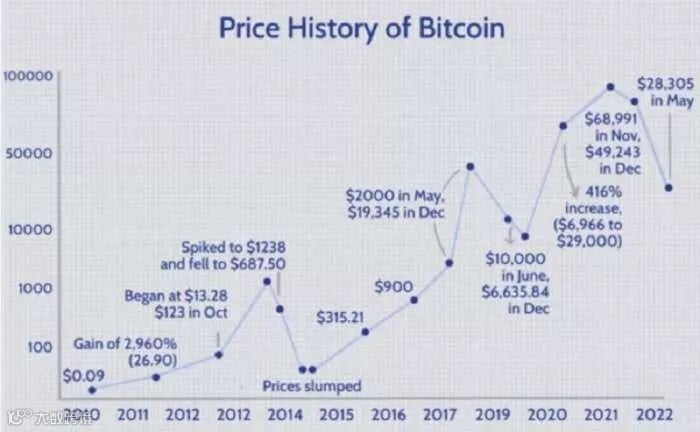 BTC从诞生到现在已经超过了10年,其价格波动有几百万倍,曾数次被宣告崩盘,最后却都又恢复生机,对此我们都会有一个疑惑,在未来BTC的价格究竟还有多大的潜力,我们可以根据下图有关比特币近十年历史走势进行猜想。