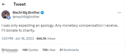 6月18日,黄立成推特发文:只是希望ZachXBT道歉,关于收到的任何赔偿都会捐给慈善机构。