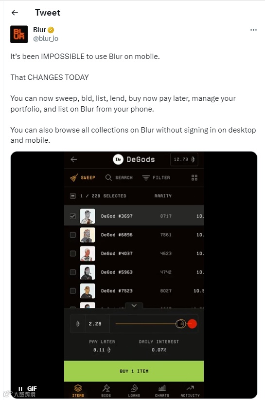 6月20日,Blur官方发推表示,NFT市场Blur已支持用户在移动设备上使用出价、上架、借贷、先买后付以及投资组合管理等功能。