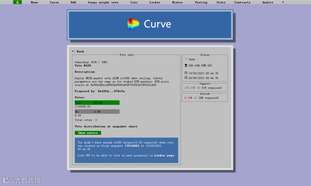 6月20日,Curve官网发起了一项提案投票,“以2亿crvUSD债务来部署WETH市场”,也就是说大家可以把自己的WETH在Curve平台质押,平台会给你等价值的crvUSD,目的是为了推动其Curve的生态发展,据悉投票将于6月26日结束。