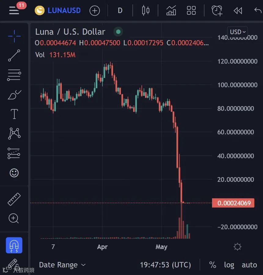 5月12日,Terra链上生态代币Luna价格4天内从90美元暴跌至0.00004美元,损失超99%,其稳定币UST价格也跌至0.09美元。价值410亿美元的生态直接灰飞烟灭,几十万人损失惨重,在暴跌过程中不断加仓的人亏得更是血本无归。