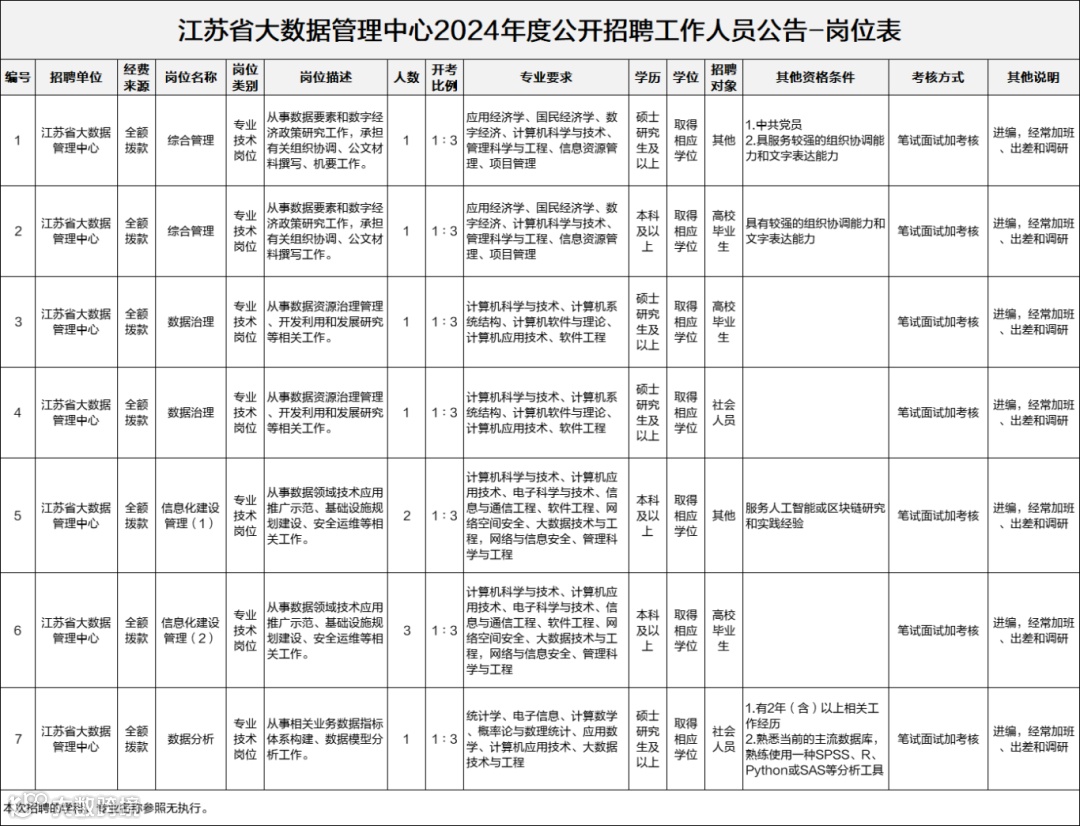 江苏省大数据管理中心是省数据局(省政务服务管理办公室)管理的副厅级公益一类事业单位,位于江苏省南京市建邺区汉中门大街145号 。主要职责是:围绕省委、省政府决策部署和省数据局中心工作,贯彻落实国家政务信息化和政务大数据发展的方针政策,负责省级大数据中心的建设管理、运维和安全保障,全省政务数据资源归口管理工作,承担省级政务信息系统整合共享相关工作,监测政务大数据发展运行态势,推进政务大数据融合运用和关联分析,加快推进全省大数据发展。为更好地选拔优秀适岗人才,充实队伍,优化结构,江苏省大数据管理中心现面向社会公开招聘优秀人才。根据《江苏省事业单位公开招聘人员办法》(苏办发〔2020〕9号)等规定,现将有关事项公告如下: