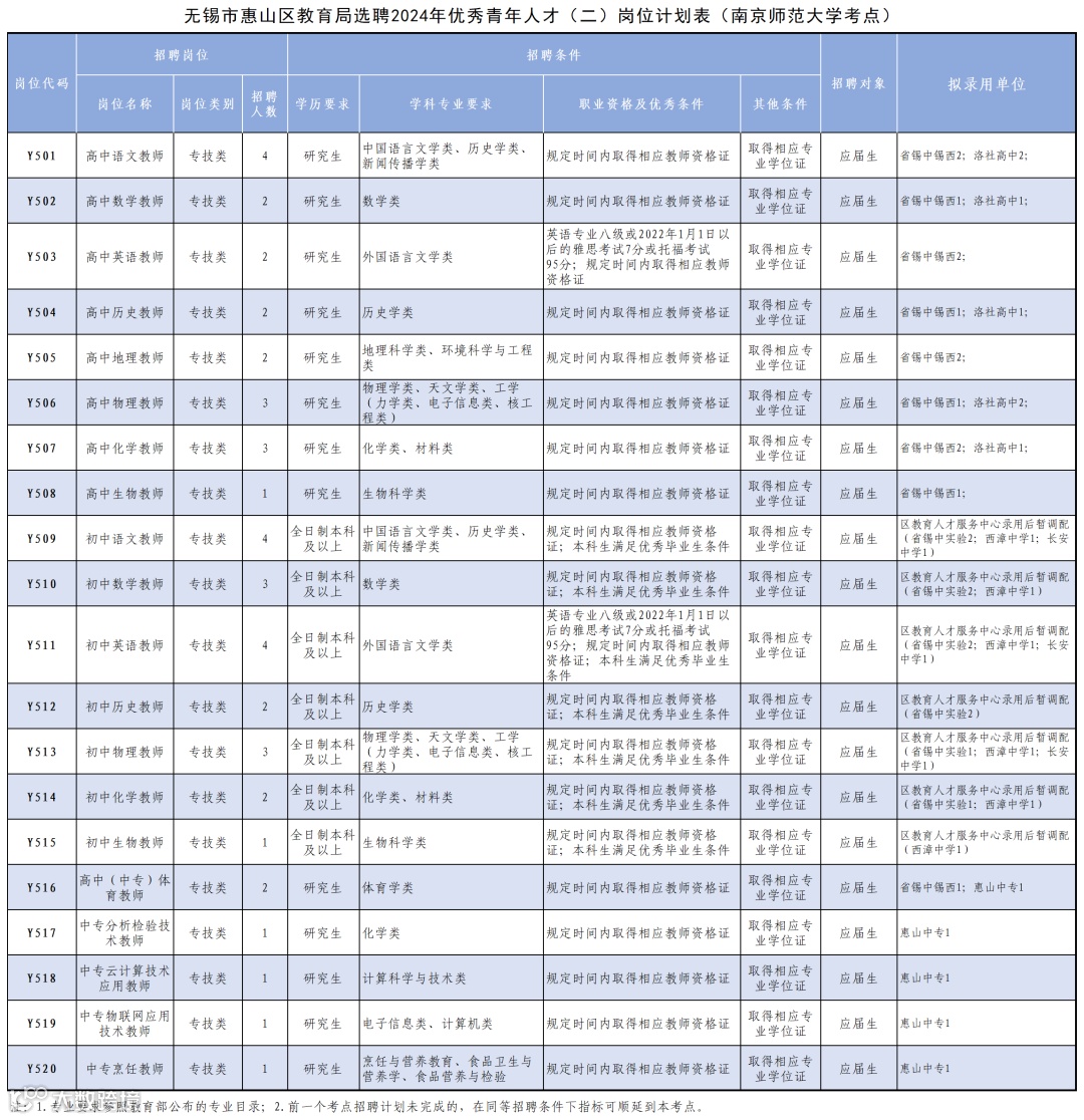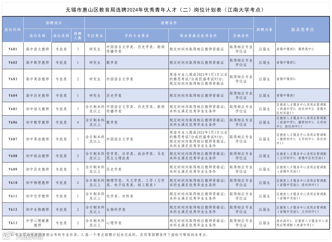4、报考岗位学科专业条件:符合《无锡市惠山区教育局选聘2024年优秀青年人才(二)岗位简介表》(附件1)“学科专业要求”。