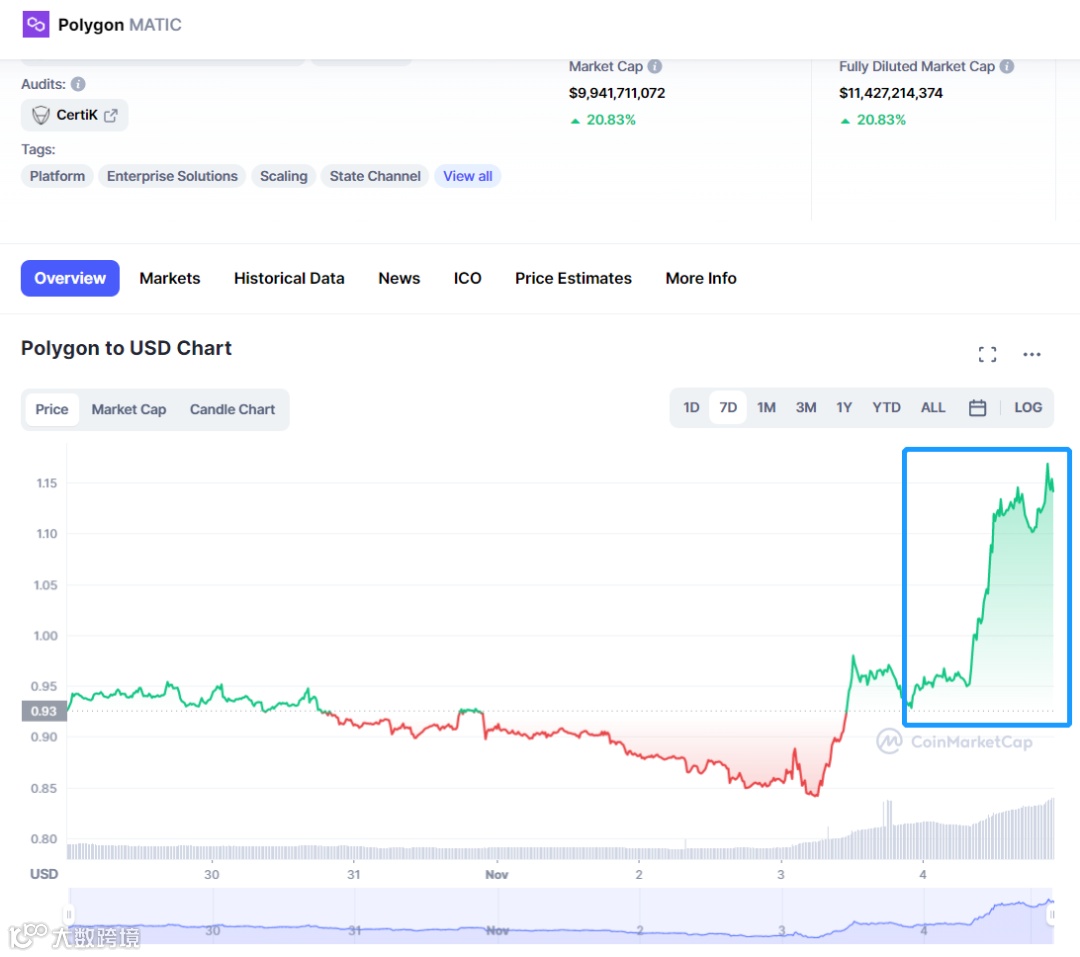 11月4日18:00,Coinmarketcap数据显示,Polygon代币马蹄(Matic)价格突破1.1美元,现报价1.1美元,单日上涨15%。以太坊和比特币价格也短期内分别突破1600美元和21000美元。