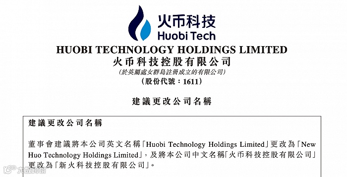 11月4日,原火币科技公众号发布消息,10月28日,一站式数字资产服务平台——新火科技控股有限公司(“新火科技”,股票代码:1611.HK)宣布,公司于日前股东特别大会通过有关更改公司名称的特别决议案,近日获英属处女群岛公司事务注册处发出的更改名称证明书,公司将正式更名为新火科技控股有限公司(“新火科技”,英文简称“New Huo Tech”)。