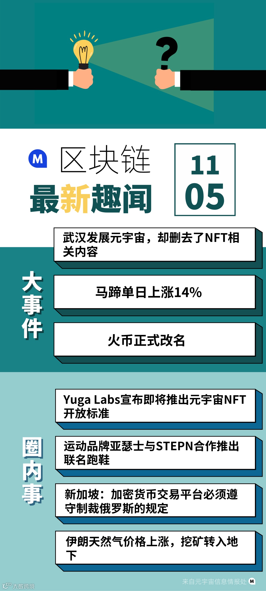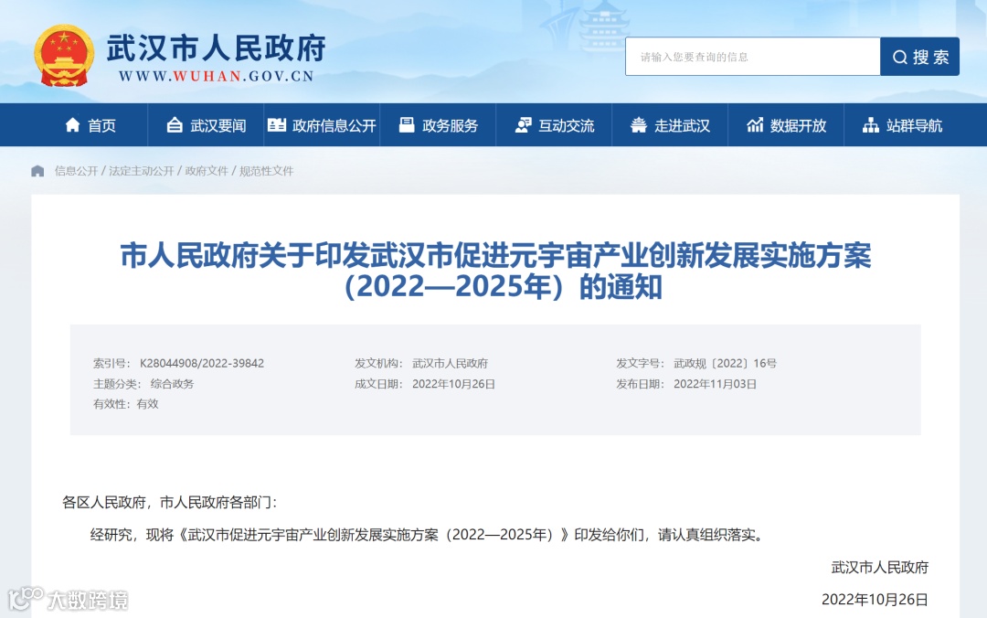 11月4日,上证报报道,武汉市人民政府正式发布《关于印发武汉市促进元宇宙产业创新发展实施方案(2022-2025年)的通知》。通知涵盖强化元宇宙技术创新、鼓励元宇宙内容创作、加速元宇宙产品培育等多个领域。相较于此前的征求意见稿,此次正式方案删除了涉及NFT的相关内容。