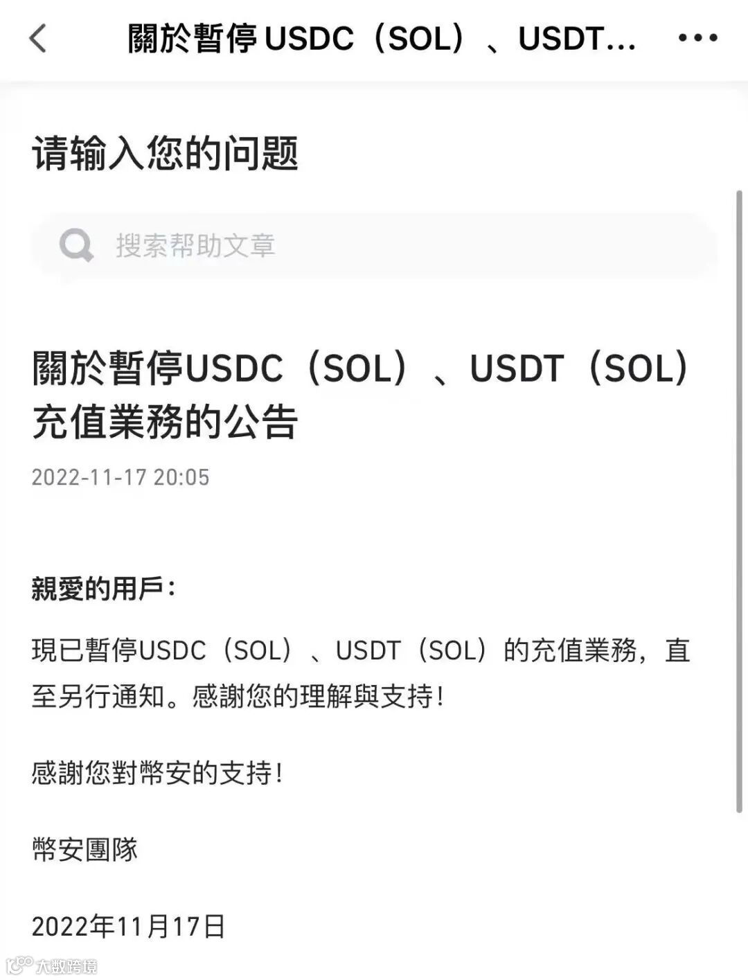 11 月 17 日,币安发布公告称已暂停 Solana 链上的 USDC、USDT 充值业务,直至另行通知。更多细节,情报处会及时关注。