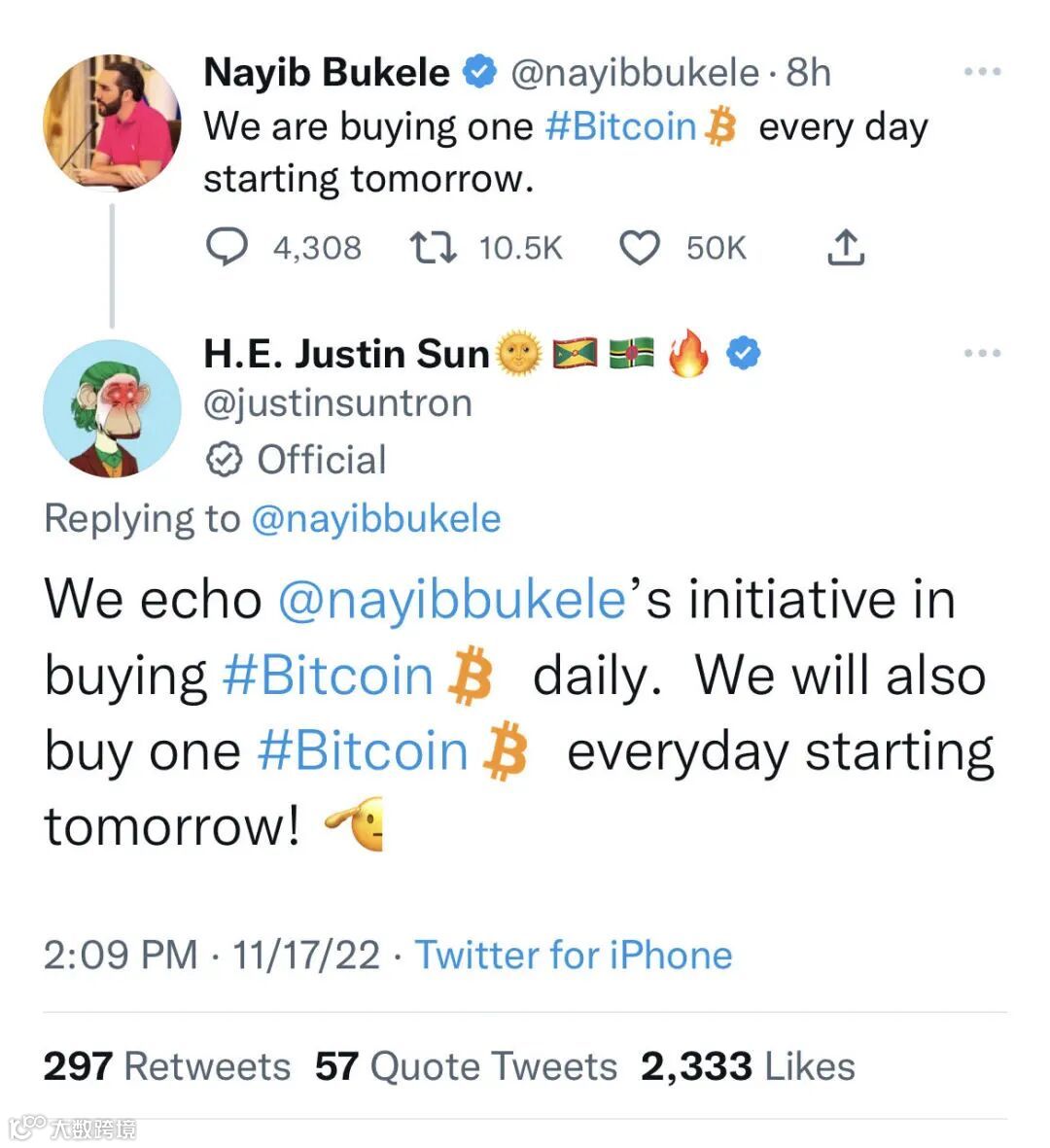 11月17日,萨尔瓦多总统Nayib Bukele在推特上以个人账号发文表示,从明天开始,每天购入一枚比特币。同一天,孙宇晨也在推特表示,为响应萨尔瓦多总统定投BTC的做法,从明天开始,“波联储”也将每日定投一枚BTC。