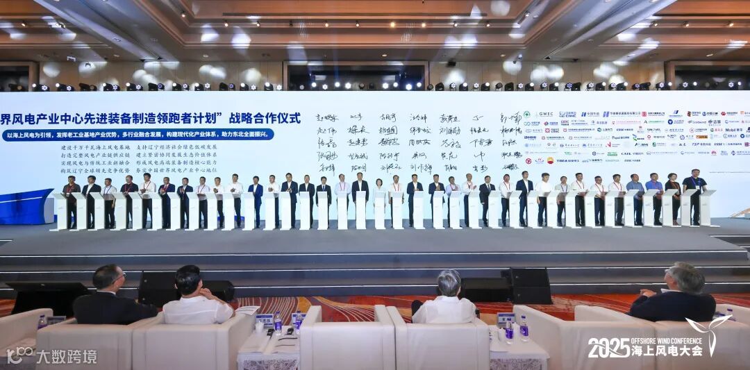 海上风电产业链长、带动力强,与传统产业天然契合;东北地区传统工业基础好、潜力足,拥有一大批代表性企业。通过将风电技术与传统工业优势相结合,既能推动传统产业的转型升级,又能突破高端轴承、齿轮箱、大功率发电机等前沿装备的核心技术,助力东北地区在风电装备制造上形成全球领先优势,是“东北老工业基地振兴战略”的重要抓手。为此,大会举行了“世界风电产业中心先进装备制造领跑者计划”战略合作仪式,35位来自政府主管部门、协会组织、电网公司以及风电、钢铁、冶金、化工、机电、造船、港口等行业龙头企业的领导上台参与了仪式。这些企业将共同发力,把辽宁打造成风电先进装备制造产业的高地。