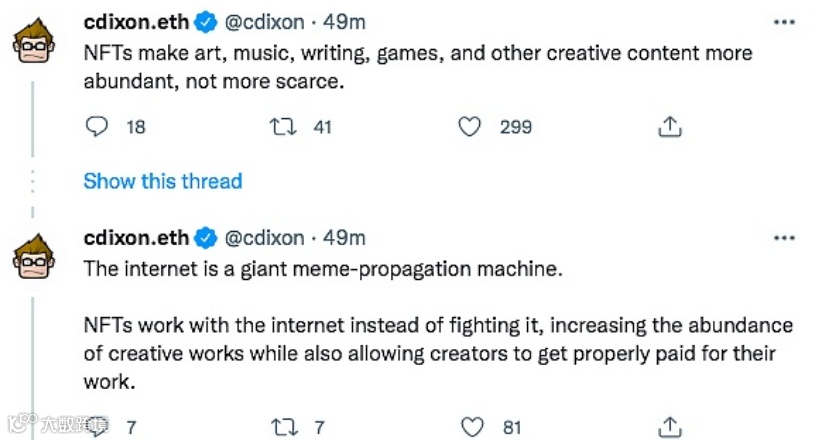 Web3支持者、a16z合伙人ChrisDixon发推表示,NFT 让艺术、音乐、写作、游戏和其他创意内容更加丰富,而不是更加稀缺。