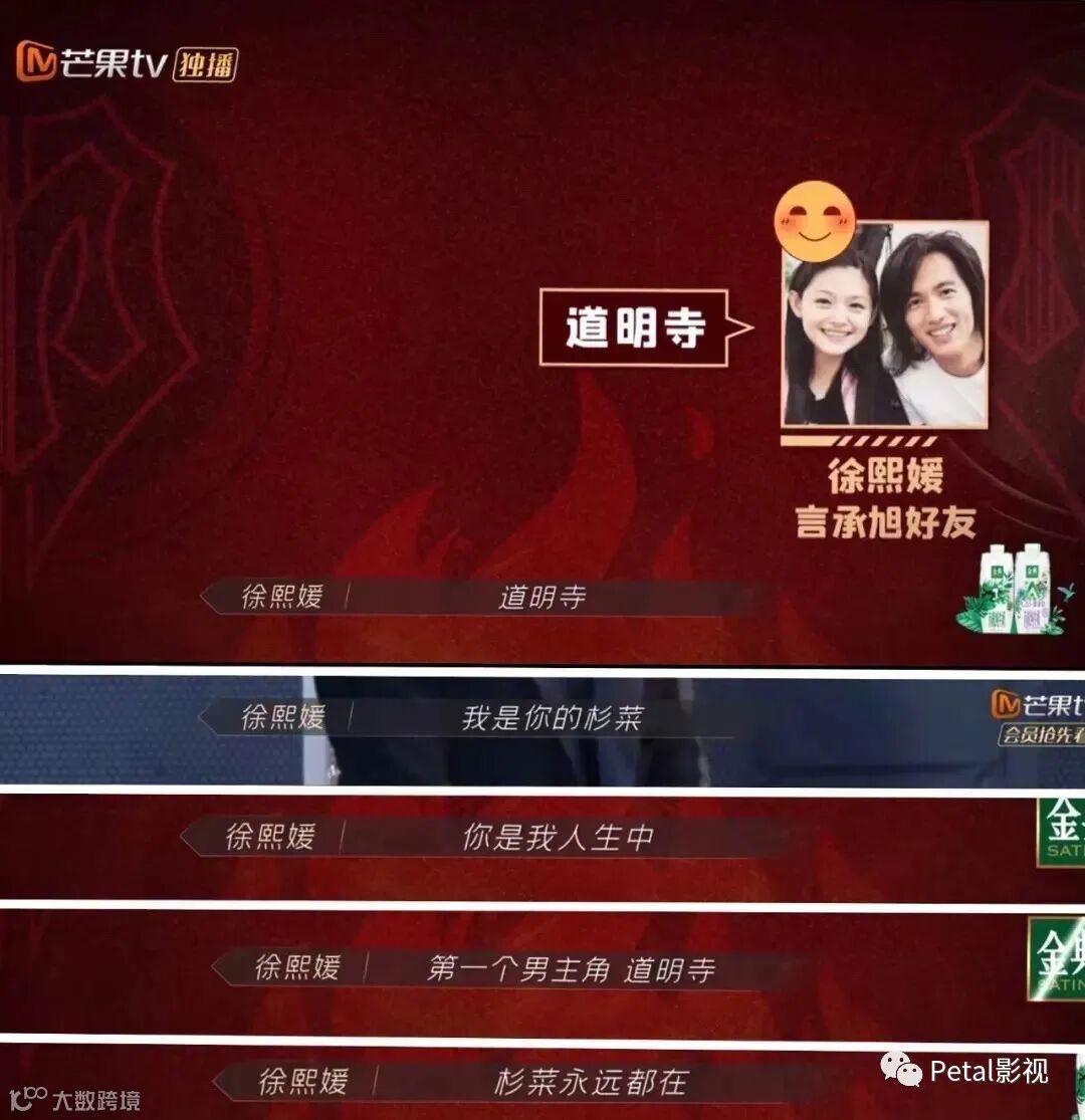 在节目里,时代的眼泪还有那些年我们一起追过的道明寺,一起追过的《流星花园》,言承旭上台前,节目组还特地放了一段大S为他打call的语音。大S的第一句话就要让人泪奔,她说“道明寺,我是你的杉菜。”