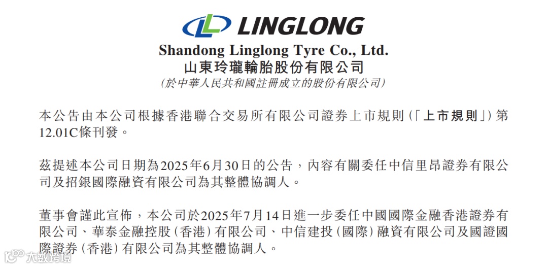 7月14日,港交所披露文件显示,山东玲珑轮胎股份有限公司(601966.SH)已正式增聘中国国际金融香港证券、华泰金融控股(香港)、中信建投(国际)融资及国证国际证券(香港)四家机构担任香港上市整体协调人。此次委任标志着这家中国领先的轮胎制造商进一步强化了其上市承销团队。