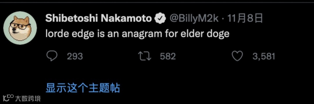 狗狗币创始人在推特上表示,“Lorde edge”是“elder doge”的变位词(即字母相同,但字母排序不同的词)。