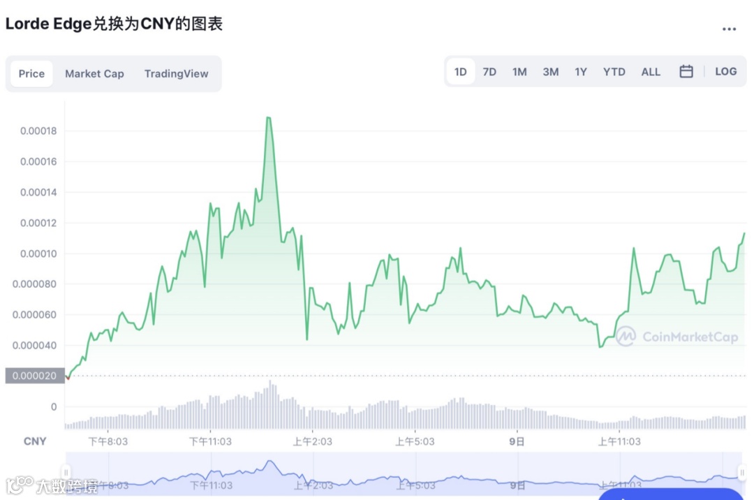 据coinmarketcap数据,北京时间11月8号周日下午6点48分左右,名为Loder Edge的加密货币正式开始交易,当时价格为0.000020元人民币左右。