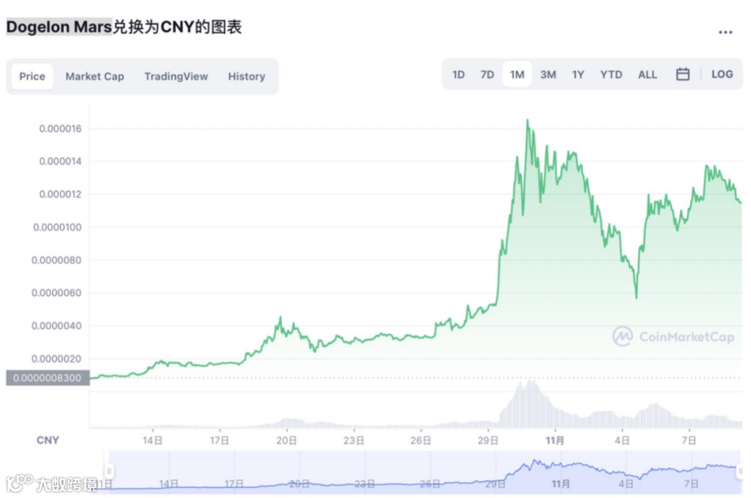 以特斯拉CEO马斯克名字命名的加密货币“狗狗埃隆火星币”(Dogelon Mars),价格也曾暴涨暴跌。