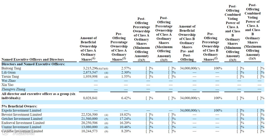 唐百通持股2.57%,管莉莉持股2.3%,汤铁鑫持股1.55%。Expola Investment Limited持股18.02%,Beveist Investment Limited持股17.24%,Endoeval Investment Limited持股16.2%,Unatee Investment Limited持股10.46%,Groadse Investment Limited持股8.2%。