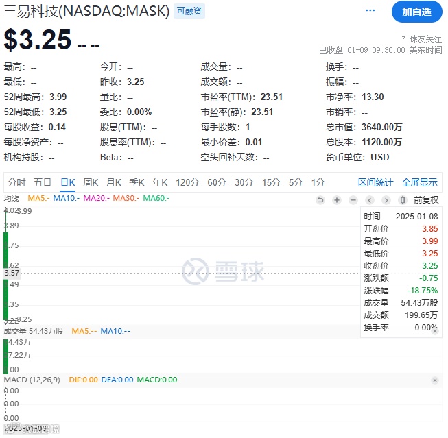 此次上市,三易科技以4美元的发行价首次公开发行了125万A类普通股,成功募资500万美元。然而在上市首日,三易科技股价表现并不理想,开盘价为3.85美元,较发行价下跌了3.75%,尽管盘中股价一度有所回升至3.99美元,但最终收盘价为3.25美元,总市值定格在3640万美元。